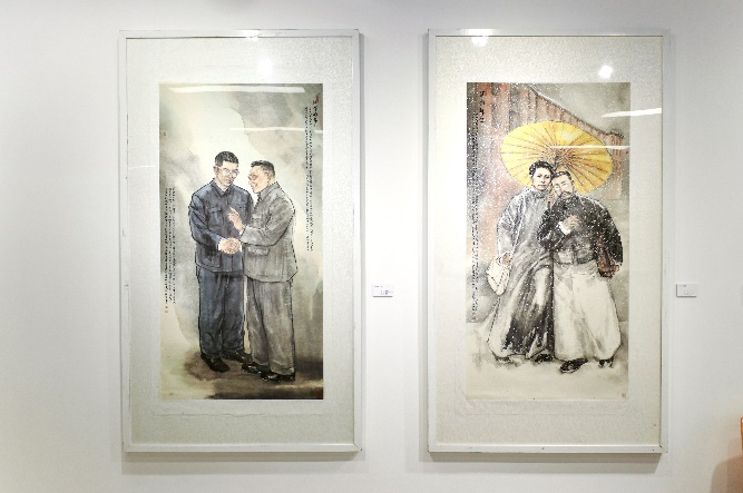此次展览汇集60余幅师生作品,以人物画为载体,铺展一幅跨越时空的精神长卷。笔墨间,有革命先辈的坚毅风骨,定格百年征程中的精神坐标;有解放区大生产运动中纺线织布的鲜活场面,再现军民同心、自力更生的奋斗图景;有新时代“大先生”的儒雅风范,传承治学育人的初心使命;还有少数民族人物写生的鲜活形象与身边劳动者的质朴身影,让艺术扎根生活、映照当下;更有传统元素与现代人物并置的课题创作,以笔墨在古典意蕴与当代审美间探寻演绎转化之道,彰显中华优秀传统文化的时代生命力。