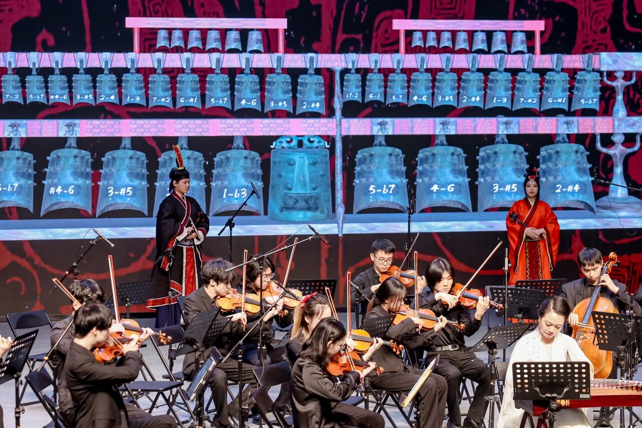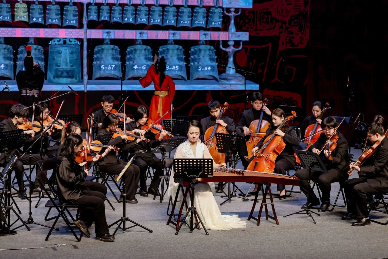 除了在京各大院校的精彩演绎,武汉音乐学院研发的“数智编钟”也为音乐会增添了独特韵味。在《太一生水》的悠远旋律中,表演者通过体感交互技术轻触虚拟编钟,唤醒战国曾侯乙编钟的千年原音,让在场观众在古今交融中领略传统文化的深厚底蕴。